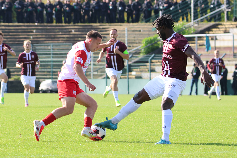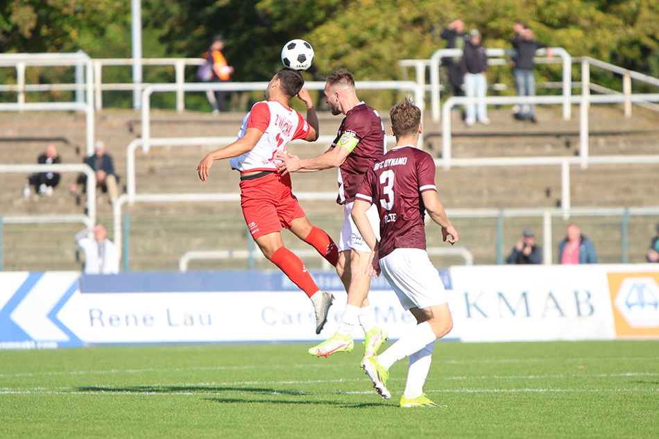 Mit viel Selbstbewusstsein ging es heute erneut nach Berlin. Beim BFC Dynamo begann die Mannschaft von Rico Schmitt mit nur einer Veränderung im Vergleich zur Vorwoche. Nick Breitenbücher begann auf der rechten Außenbahn für Lennert Möbius. Von Beginn an war der FSV am Drücker. Ein Freistoß von Martens brachte erstmals Gefahr vor das Tor der Hauptstädter, doch Somnitz verpasste in der Mitte (4.). Nach einer Ecke für den BFC konterte der FSV mustergültig. Haubner schickte Breitenbücher, der auf und davon ging, am Ende aber vorbeischoss (8.). Als Martens Eixler schön freispielte wäre die Führung eigentlich fällig gewesen, hier scheiterte Eixler völlig frei an Ortegel (11.). Und weiter nur der FSV: Ein Schuss von Martens wurde vom Torhüter an den Innenpfosten gelenkt und sprang aus dem Tor (20.). Wenig später noch einmal Eixler, der von einem Fehler der Abwehr profitierte, wieder war großgewachsene Offensivspieler gegen Ortegel zweiter Sieger (24.). Auch danach hatten weder Ziemer noch Startsev Glück bei ihren Distanzschüssen (28., 30.). Und so wäre der Chancenwucher fast unmittelbar bestraft worden. Plötzlich war Putaro frei durch, doch auch Hiemann hielt seinen Kasten sauber (31.). Der BFC agierte nun mutiger und hatte eine weitere gut Möglichkeit. Breitfeld trieb über die rechte Seite den Ball nach vorne und fand Knezevic. Der zog ab und traf die Latte (38.). Den Schlusspunkt einer interessanten ersten Halbzeit setzte noch einmal Putaro, der allerdings ebenfalls vorbeischoss (45.).
