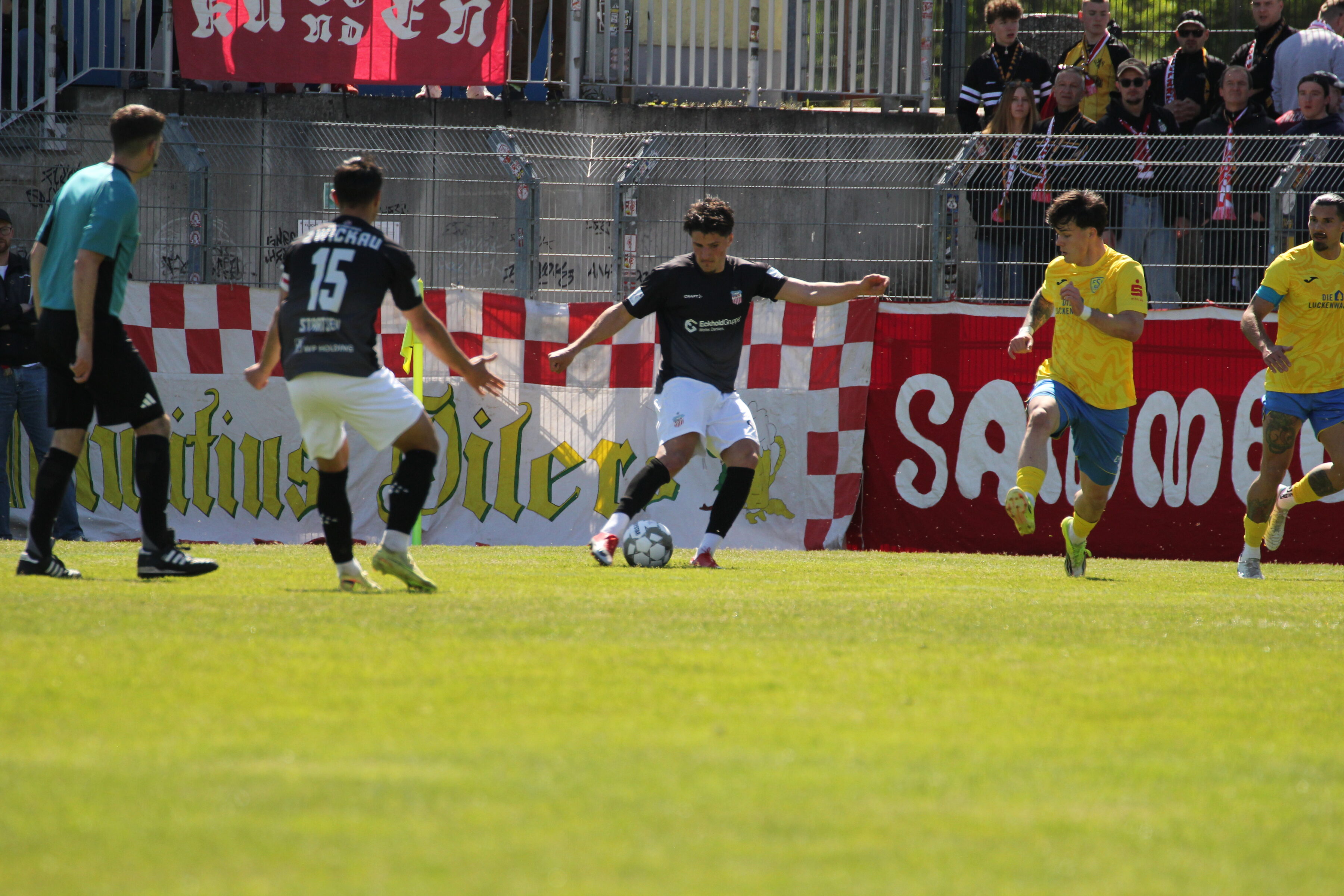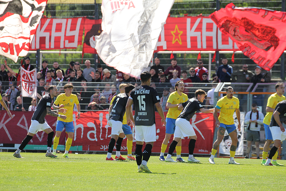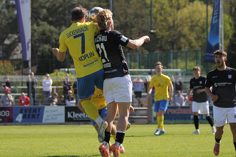 Für unseren FSV hieß es heute: Zurück in den Ligaalltag. Es ging in den Landkreis Teltow-Fläming zum FSV Luckenwalde. Trainer Rico Schmitt änderte seine Startelf im Vergleich zum Pokalspiel in Riesa auf drei Positionen: Für Eixler, Prasse und Sezer begannen Sengersdorf, Haubner und Breitenbücher. Die Luckenwalder spielen eine starke Saison und hatten auch gleich die erste gute Möglichkeit. Nachdem Breitenbücher am Strafraum ein Foul gezogen hatte, trat Meier an. Haubner in der Mauer konnte den Ball allerdings entscheidend abfälschen (3.). Als Ziemer gegen Bachmann einen Zweikampf verloren hatte, kam der Luckenwalder zum Abschluss. Sein Schuss mit dem schwachen Fuß war für Hiemann kein Problem (14.). Im Gegenzug dann auch einmal unser FSV: Dobruna zog wuchtig ab, doch Palmowski parierte (15.). Zwickau stand recht tief und lauerte auf Umschaltmomente. Die gab es mit zunehmender Spielzeit dann auch immer häufiger. Möbius trieb den Ball über rechts nach vorne, statt abzulegen versuchte er Palmowski zu überwinden, was nicht gelang (28.). Ein schöner Spielzug über Möbius und Senkbeil brachte Dobruna ins Spiel, der das Tor verfehlte (40.). Kurz vor der Pause dann die bislang beste Zwickauer Möglichkeit. Möbius legte mit dem Rücken zum Tor auf Dobruna ab, der volles Risiko ging, den Ball aber am Tor vorbei setzte (45.).