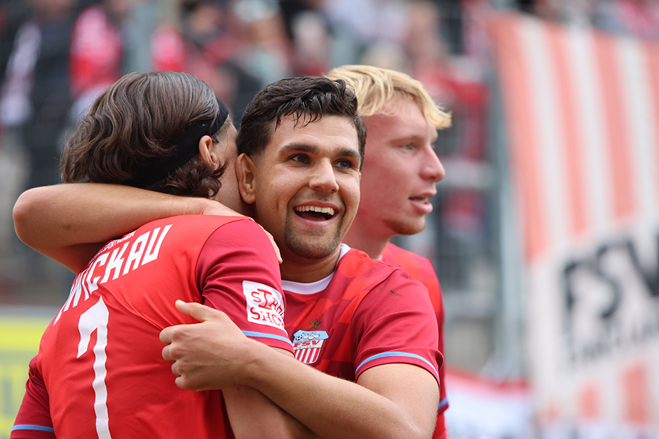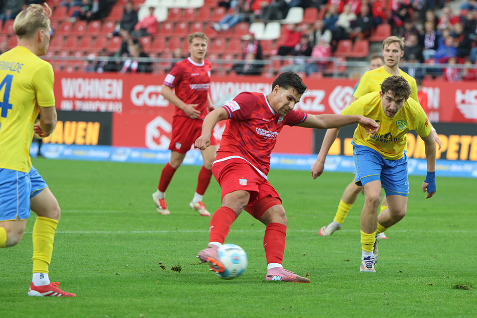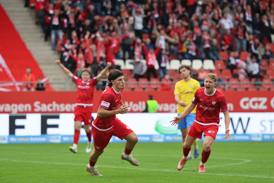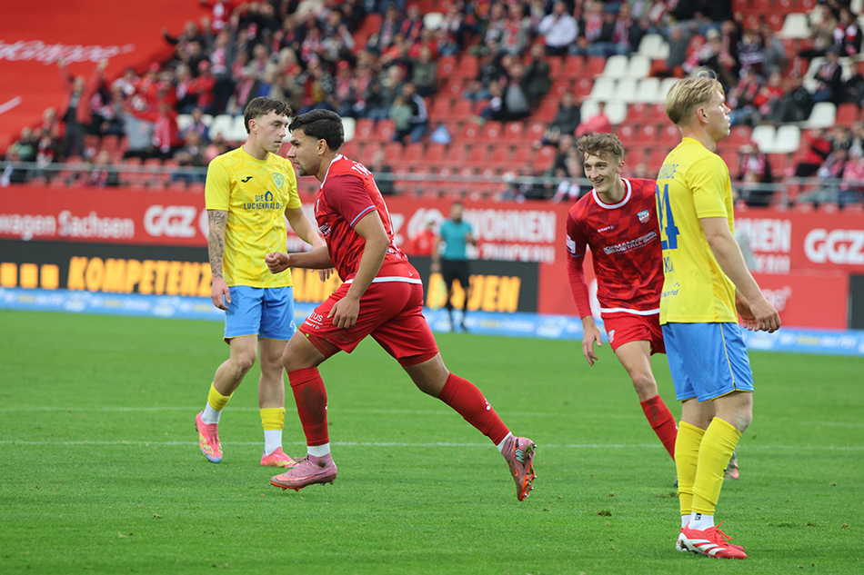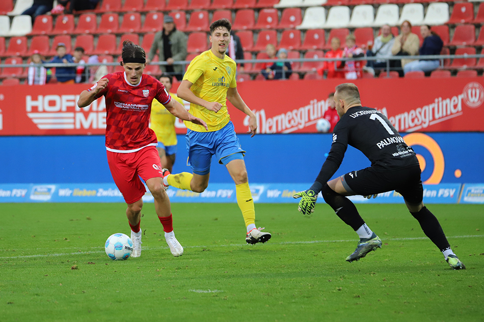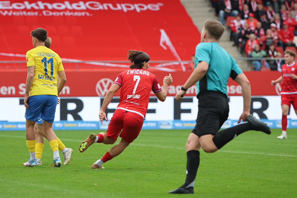 Heute war der FSV Zwickau wieder in der heimischen GGZ Arena gefordert. Gegen den FSV 63 Luckenwalde veränderte FSV-Trainer Rico Schmitt seine Startelf auf zwei Positionen: Cemal Sezer gab sein Startelfdebüt und Theo Martens kehrte nach Erkrankung zurück. Dafür nahmen Nick Breitenbücher und Lennert Möbius auf der Bank Platz. Der FSV startete mit viel Ballbesitz. Luckenwalde stand tief und nah am Mann. Aus einer Umschaltaktion hatten dann auch die Gäste die erste Gelegenheit im Spiel. Maciejewski ging über rechts auf und davon. Sein Abschluss wurde von Hiemann zur Ecke pariert (5.). Doch das sollte erst einmal die einzige Chance für die Gäste bleiben. Zwickau machte nun richtig Druck und kam zu guten Chancen. Sezer schoss unter Bedrängnis aus spitzem Winkel aufs Tor und verfehlte es nur knapp (11.). Und Sezer stand gleich wieder im Fokus. Der Neuzugang aus Jena stibitzte seinem Gegenspieler den Ball weg und legte auf Martens ab. Dessen Abschluss wurde noch abgeblockt (16.). Wenig später war es dann Dobruna, der den Ball aus Nahdistanz aufs Tor brachte, doch Pollasch war noch dazwischen (19.). Ein wunderbarer Spielzug brachte die Führung für unseren FSV. Sezer behauptete das Spielgerät und passte zu Haubner. Der sah, dass Dobruna auf links einlief. Dobruna machte noch einen Haken und traf sehenswert zum 1:0 (29.). Auch nach der Führung blieb der FSV am Drücker. Der eingewechselte von Baer flankte mit Schnitt in die Mitte, wo Sezer am Tor vorbei köpfte (33.). Schließlich hatten auch noch Martens und Dobruna eine Doppelchance, doch bis zur Pause blieb es bei der knappen Führung.