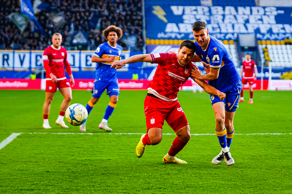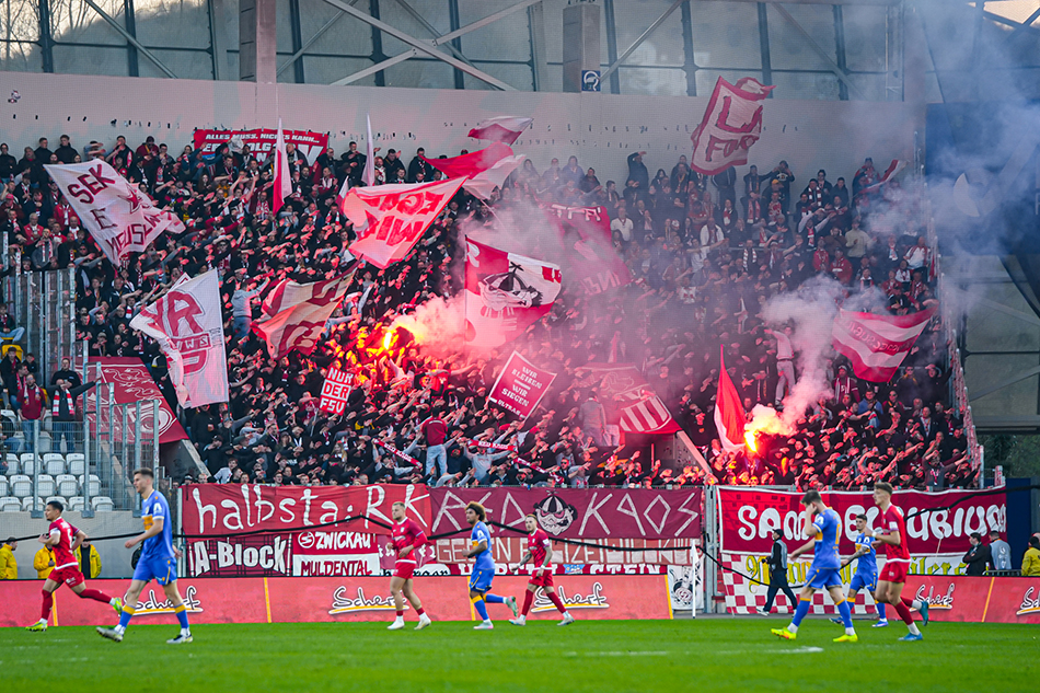 Unser FSV Zwickau war heute beim FC Carl Zeiss Jena zu Gast. Mit einem ausverkauften Gästeblock im Rücken wollte man an die erfolgreichen letzten beiden Auswärtsspiele in Jena anknüpfen. Rico Schmitt änderte seine Startelf im Vergleich zum Remis gegen den BFC auf lediglich einer Position: Für von Baer spielte Fobassam. Die Partie brauchte gut 15 Minuten, nahm dann aber enorm Fahrt auf. Zunächst war der Ball im Jenaer Tor, doch der Treffer von Sezer wurde wieder einmal wegen einer Abseitsstellung verwehrt. Auf der anderen Seite trafen wenig später die Gastgeber. Zunächst verpasste Burmeister in der Mitte, doch der Ball kam erneut in den Strafraum, wo Oduah per Kopf das 1:0 erzielen konnte (17.). Vom Schock noch gar nicht richtig erholt klingelte es wenig später erneut. Lankford spielte nach innen, wo Prokopenko mit Hilfe des Innenpfostens das 2:0 erzielen konnte (20.). Der FSV steckte nicht auf und wollte schnell den Anschluss schaffen. Ein Kopfball von Dobruna wurde noch abgewehrt (24.). Gleich darauf war es erneut Dobruna, der mit einem fulminanten Schuss aus 25m die Latte traf (25.). Ein stark getretener Freistoß von Sezer wurde ebenso stark von Liesegang pariert (26.). In diesem Powerplay gelang dann doch der Anschluss. Senkbeil mit Flanke in die Mitte, wo Dobruna mustergültig zum 2:1 einköpfte (28.). Als dann Dobruna im Strafraum am Fuß getroffen wurde, blieb die Pfeife des Schiedsrichters stumm (34.). Auch der FC Carl Zeiss hatte seine Chancen. Hiemann parierte in dieser Phase zwei Mal stark gegen Oduah (36., 38.). Einen Aufreger gab es noch. Dobruna mit langem Ball auf Möbius. Torwart Liesegang kam raus und Möbius fällt. Schiri Riemer gab nach Abstimmung mit seinem Assistenten gelb für den Zwickauer. Bei einem Foul hätte Liesegang vom Platz gemusst. Nach ereignisreichen 45 Minuten ging es in die Pause.