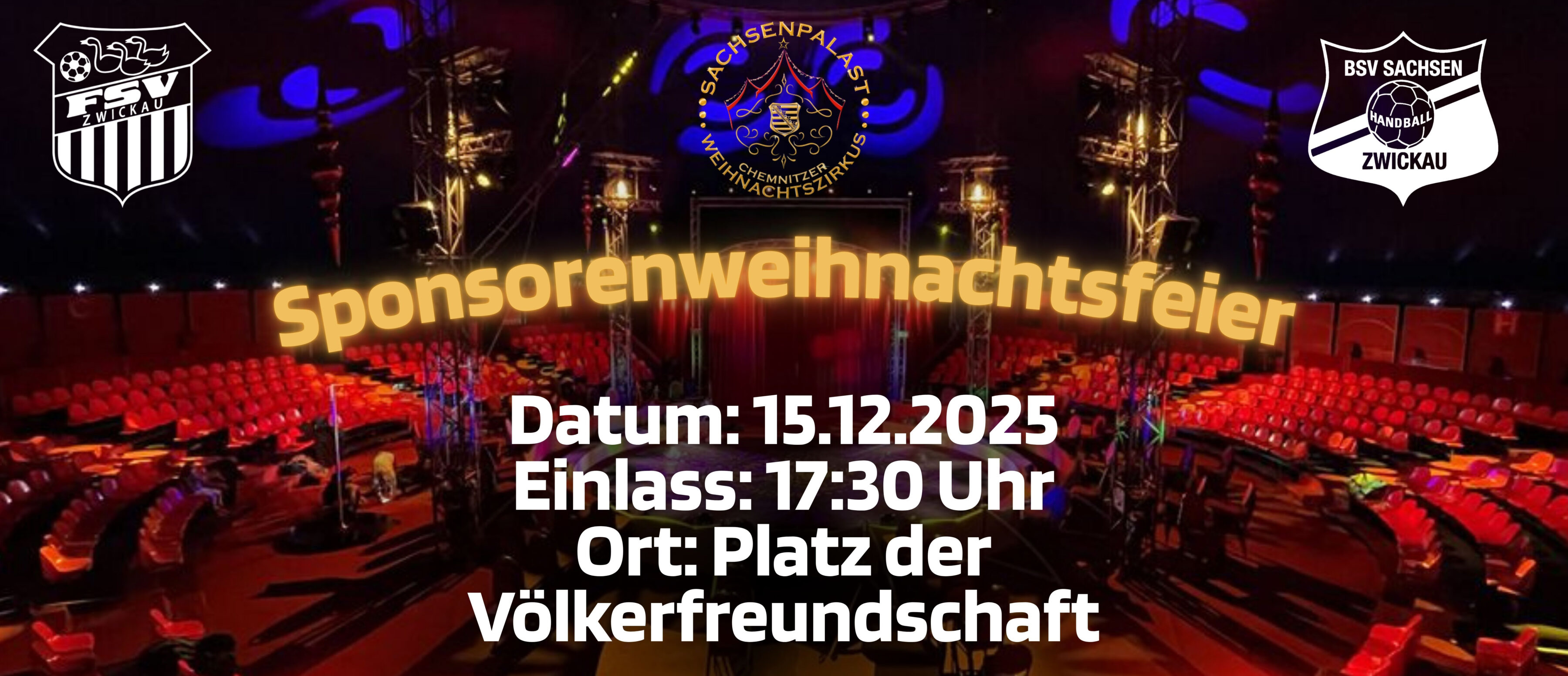 Getreu dem Motto „Manege frei!“ hoffen wir, Sie am 15. Dezember ab 17:30 Uhr im Weihnachtszirkus „Sachsenpalast“ auf dem Platz der Völkerfreundschaft in Zwickau begrüßen zu dürfen.